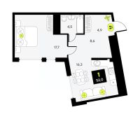 Просторная однокомнатная квартира с предчистовой отделкой в ЖК "Дивный квартал у озера" на 16 этаже. Общая площадь: 52 кв.м., жилая: 17.8 кв.м., площадь просторной кухни-столовой: 16.2 кв.м. Квартира угловая, очень светлая, естественная вентиляция при открытии окон. В квартире один совмещенный санузел. Высота потолков 2.7 м.