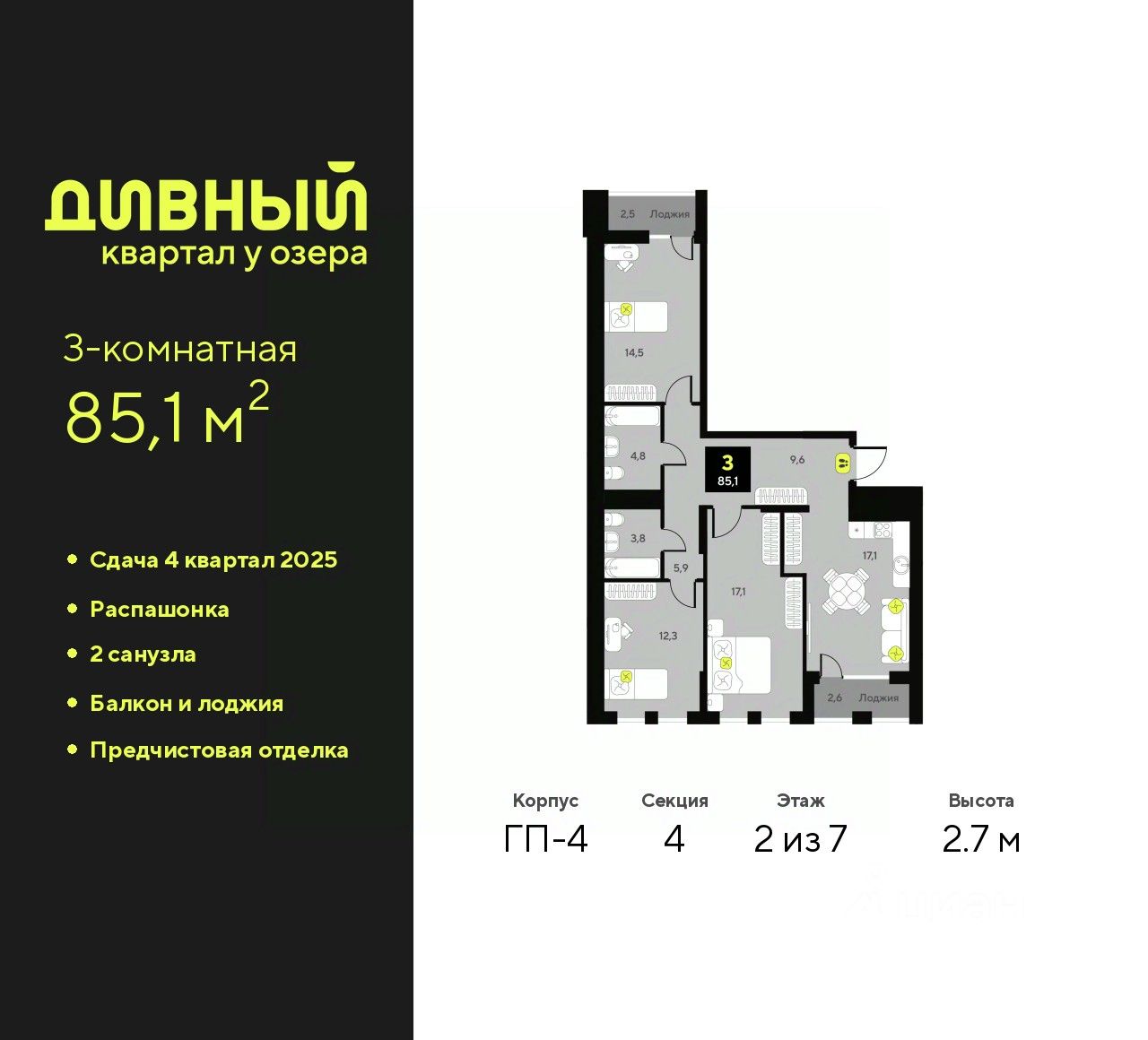 3-комн. квартира с предчистовой отделкой в ЖК "Дивный квартал у озера" на 2 этаже. Общая площадь: 85.1 кв.м., жилая: 43.9 кв.м., площадь просторной кухни-столовой: 17.1 кв.м. Квартира - распашонка, без проходных комнат, окна выходят на paзные стороны дома. В квартире один балкон и одна лоджия, два совмещенных санузла. Высота потолков 2.7 м.