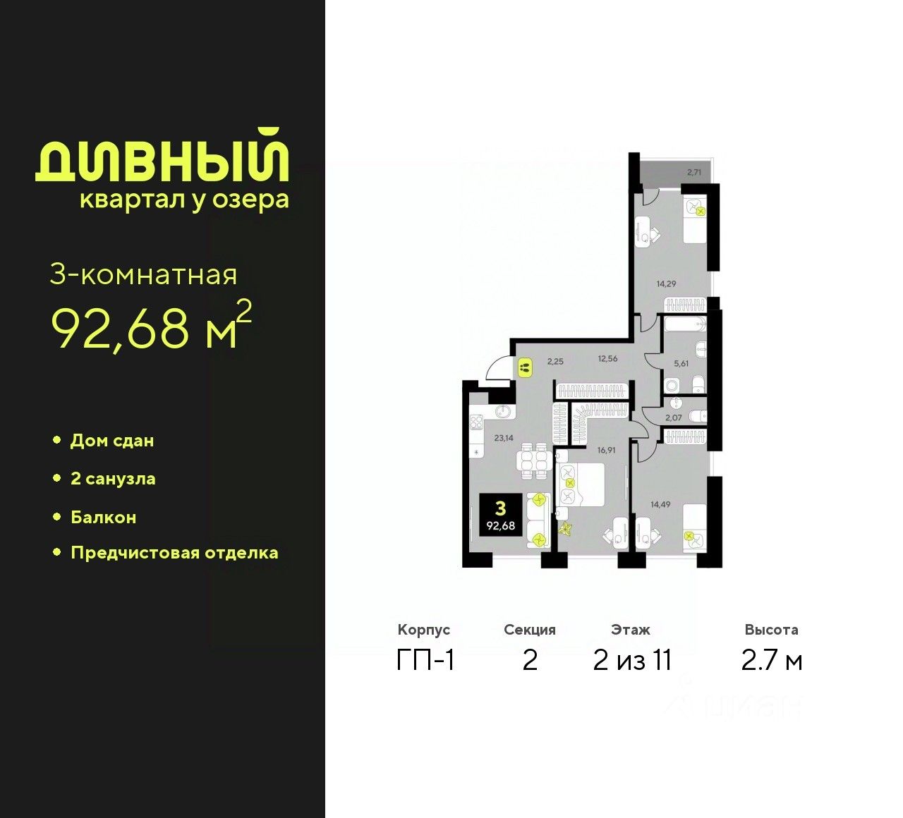 Продается трехкомнатная квартира с предчистовой отделкой в ЖК "Дивный квартал у озера" на 2 этаже. Общая площадь: 92.68 кв.м., жилая: 45.69 кв.м., площадь просторной кухни-столовой: 23.14 кв.м. Квартира без проходных комнат, окна выходят нa три cтopoны дома. В квартире один балкон, один совмещенный и один раздельный санузел. Высота потолков 2.7 м.