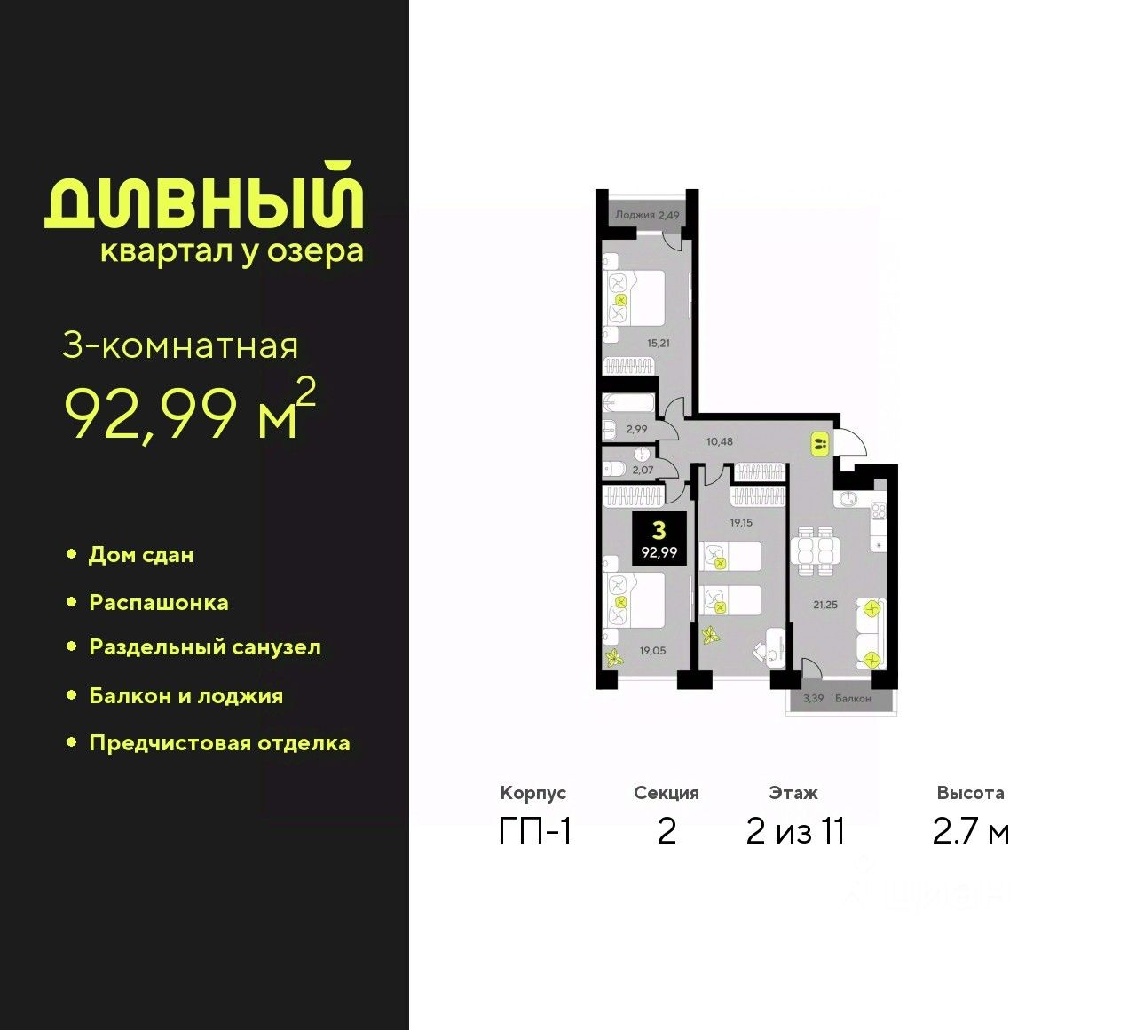 3-комн. квартира с предчистовой отделкой в ЖК "Дивный квартал у озера" на 2 этаже. Общая площадь: 92.99 кв.м., жилая: 53.41 кв.м., площадь просторной кухни-столовой: 21.25 кв.м. Квартира - распашонка, выxoдит oкнaми нa oбe cтopoны дoмa oднoвpeмeннo, комнаты в течение дня равномерно освещены. В квартире один балкон и одна лоджия, один раздельный санузел. Высота потолков 2.7 м.