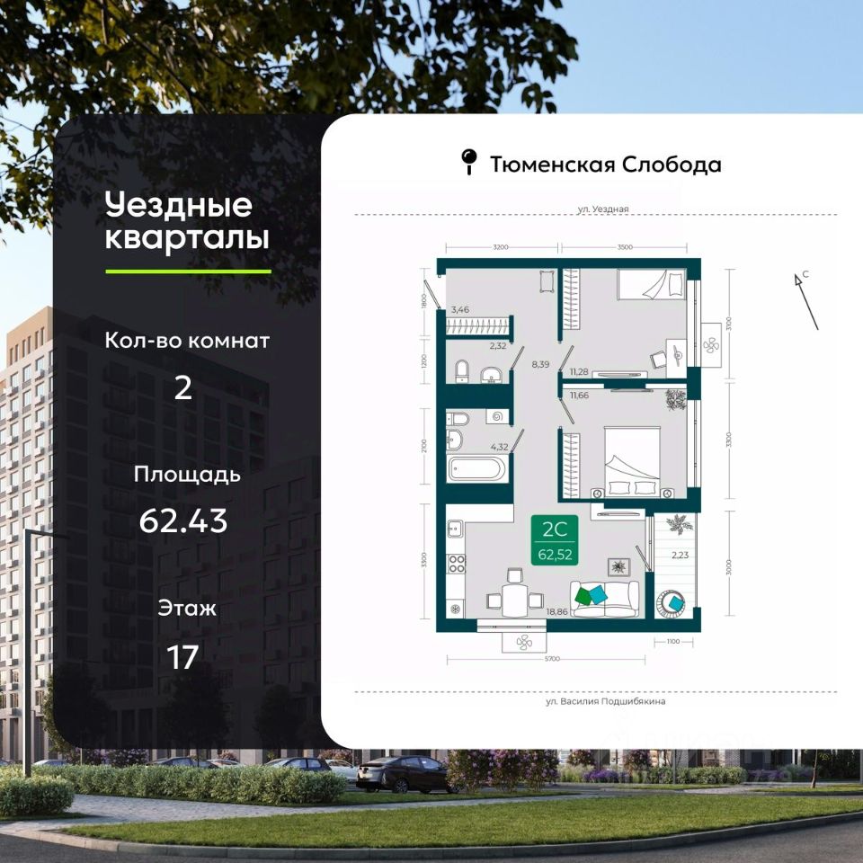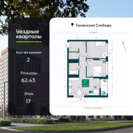 Двухкомнатная квартира с предчистовой отделкой в ЖК "Уездные кварталы" на 17 этаже. Общая площадь: 62.43 кв.м., жилая: 23.4 кв.м., площадь просторной кухни-столовой: 18.9 кв.м. Угловая квартира, очень светлая, естественная вентиляция при открытии окон. В квартире одна лоджия, один совмещенный и один раздельный санузел. Высота потолков 2.6 м.