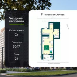 Продается однокомнатная квартира-студия от застройщика в ЖК "Уездные кварталы" на 21 этаже. Квартира без отделки, после выдачи ключей можно делать ремонт. Общая площадь: 30.17 кв.м. Высота потолков 2.6 м.