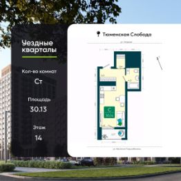 1-комн. квартира-студия в ЖК "Уездные кварталы" на 14 этаже. Квартира без отделки, полностью готова к ремонту. Общая площадь: 30.13 кв.м., площадь гостиной 16.3 кв.м., из которых 5 кв.м. выделено под кухонную зону. Все окна выходят на одну сторону. В квартире один балкон, один совмещенный санузел. Высота потолков 2.6 м.