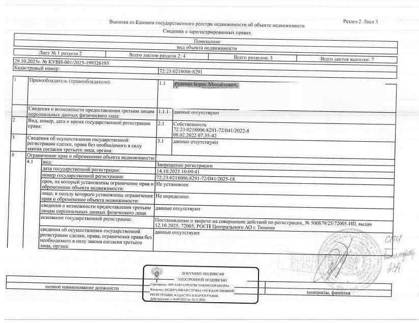 Должник: Руденко Б.М., собственник: Руденко Б.М. Лот: Жилое помещение (квартира), площадь 94,2 кв.м., кадастровый номер: 72:23:0218006:8291, г. Тюмень, ул. Холодильная, д. 138, кв. 154 (зарегистрирован 1 человек, задолженность по капитальному ремонту на 11.11.2025 составляет - 8 т.р.), н/ц: 8798053 р., з-к: 8798 р., код: 0014, рег. 72-010558;