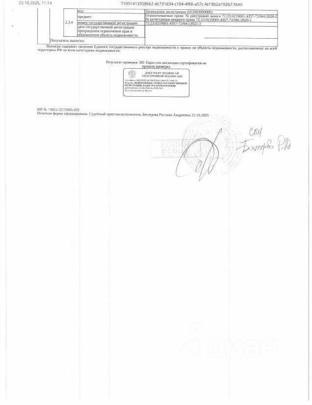 Должник: Большова В.В., собственник: Большова В.В. Лот: Жилое помещение (квартира), площадь 44,4 кв.м., кадастровый номер: 72:23:0219001:4357, г. Тюмень, ул. Мельникайте, д. 95, кв.35 (зарегистрированные лица отсутствуют, задолженность за кап. ремонт на 01.06.25 - 6 т.р.), н/ц: 4085600 р., з-к: 612840 р., код: 0001, рег. 72-010560;