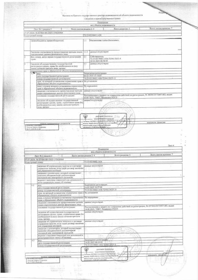 Должник: Филимонова А.В. собственник: Филимонова А.В. Лот: Жилое помещение (квартира), площадь 18,6 кв.м., кадастровый номер: 72:23:0219002:1438, г. Тюмень, ул. Энергетиков, д.44 А, ком.425, (зарегистрированы 3 взрослых, задолженность за кап. ремонт на 03.07.2025- 200р), н/ц: 1477385 р., з-к: 221608 р., код: 0001, рег. 72-010188;