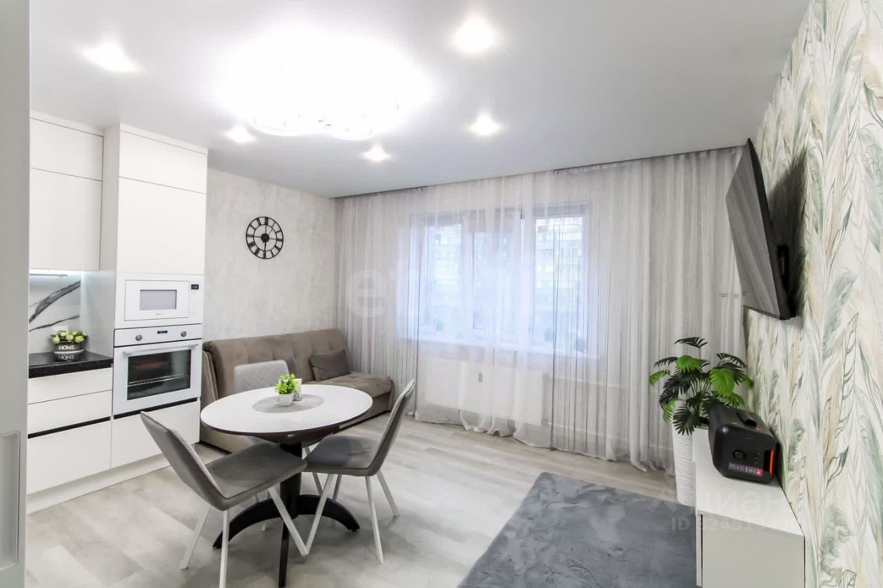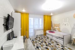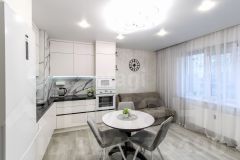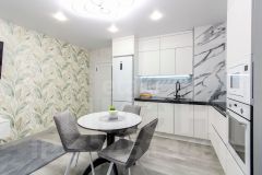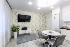 Квартира оформлена и обставлена качественно и со вкусом. В светлых тонах, но с яркими акцентами (стены — яркий современный акцент). Есть дополнительное точечное освещение, а на полу кварц винил — износостойкий, современный и просто красивый материал.