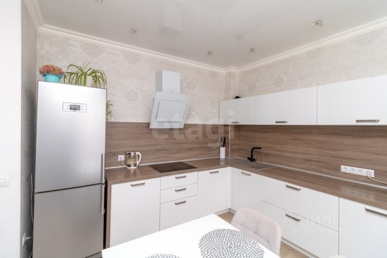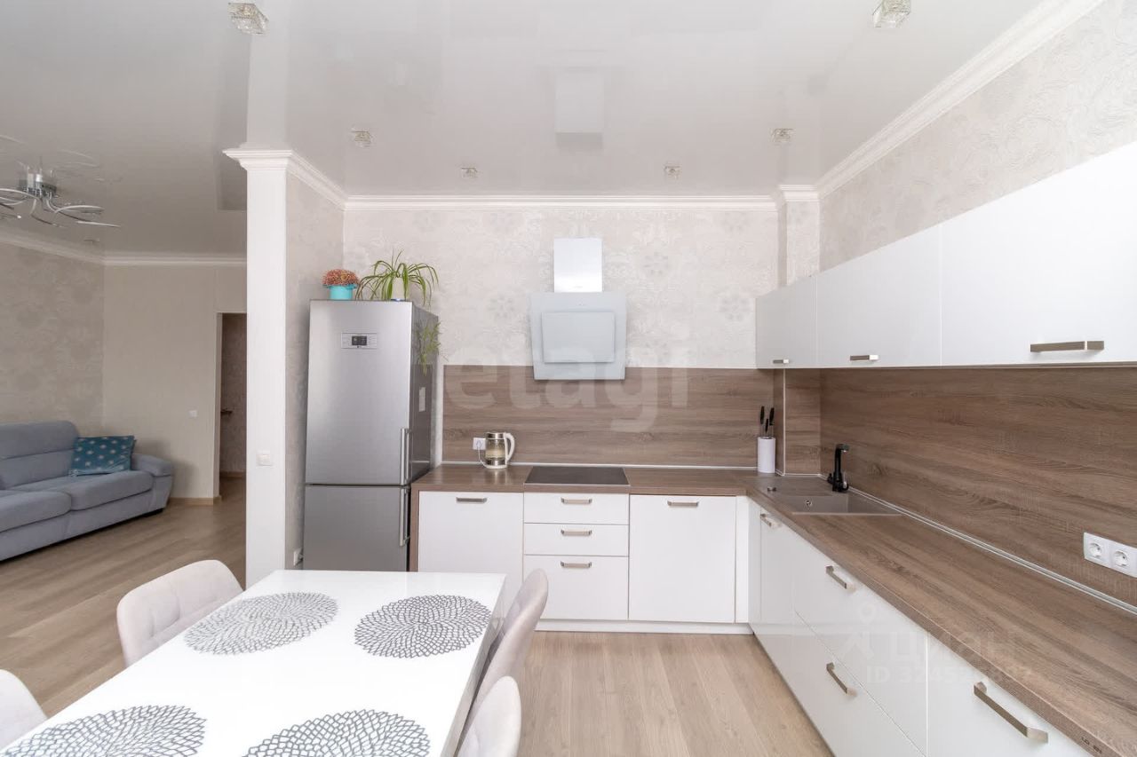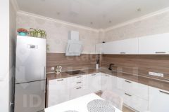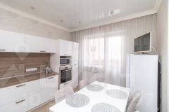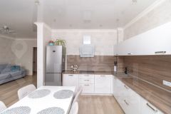 Кухня соединена с залом — это делает пространство более открытым и удобным для жизни. На кухне установлен стильный кухонный гарнитур фирмы Лорена, который не теряет своей актуальности. Ремонт в квартире выполнен в светлых тонах, использовались качественные материалы: полы - ламинат высокого класса прочности, натяжные потолки, обои сдержанных и лаконичных оттенков. Всё в идеальном состоянии — заезжай и живи.