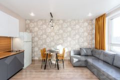 Квартира полностью укомплектована всей необходимой мебелью и техникой, включая шкафы в прихожей и санузле.