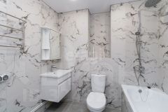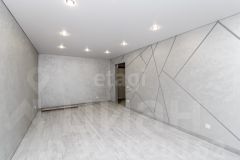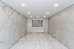 В квартире выполнен качественный косметический ремонт: на стенах декоративная штукатурка, установлены натяжные потолки с точечными светильниками, уложены долговечные напольные покрытия — коммерческий линолеум и керамогранит. Совмещенный санузел полностью отделан плиткой. Высокие потолки усиливают ощущение простора и наполняют пространство светом.