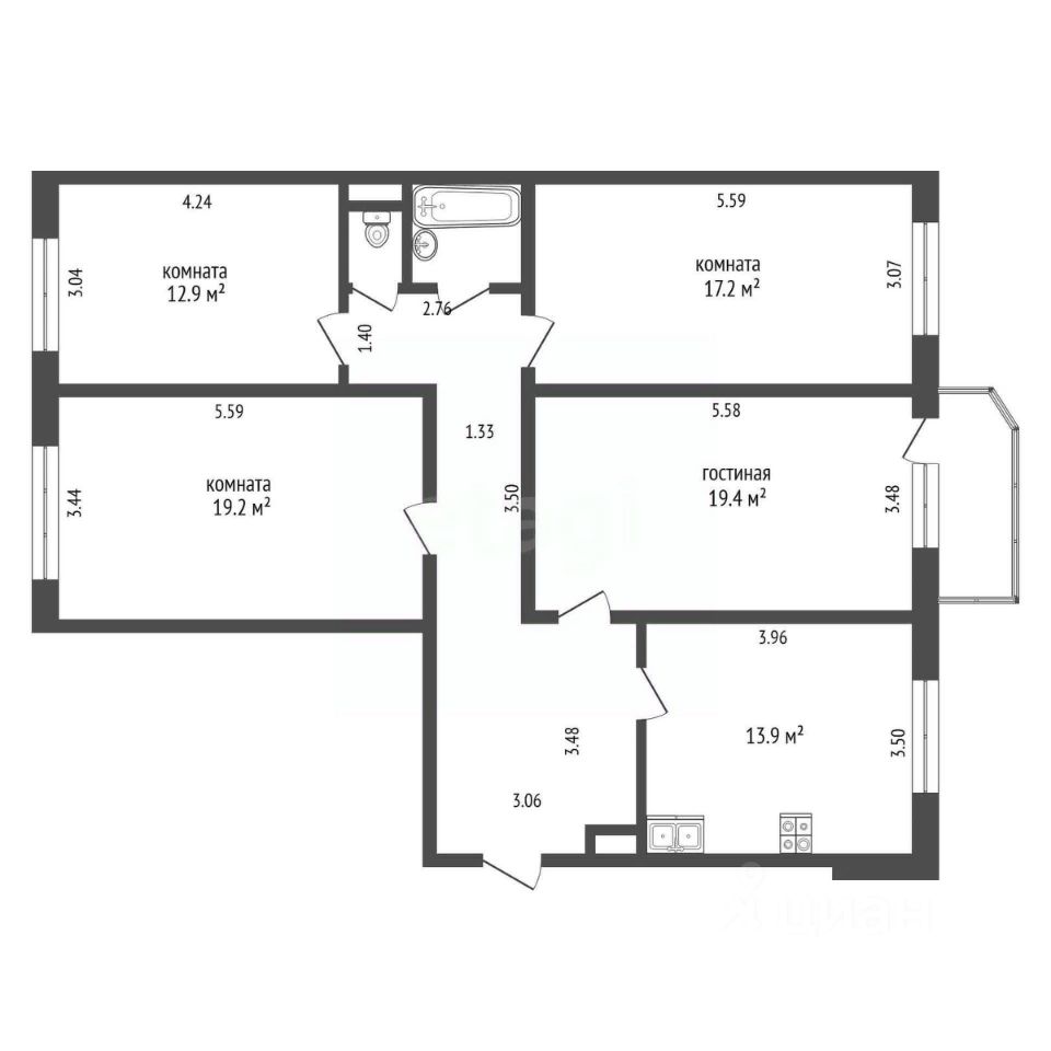 Квартира общей площадью 105.3 кв.м. это 4 просторные изолированные комнаты 12.9 кв.м., 19.2 кв.м., 17.2 кв.м., 19.4 кв.м., кухня 13.9 кв.м. и раздельные санузлы.