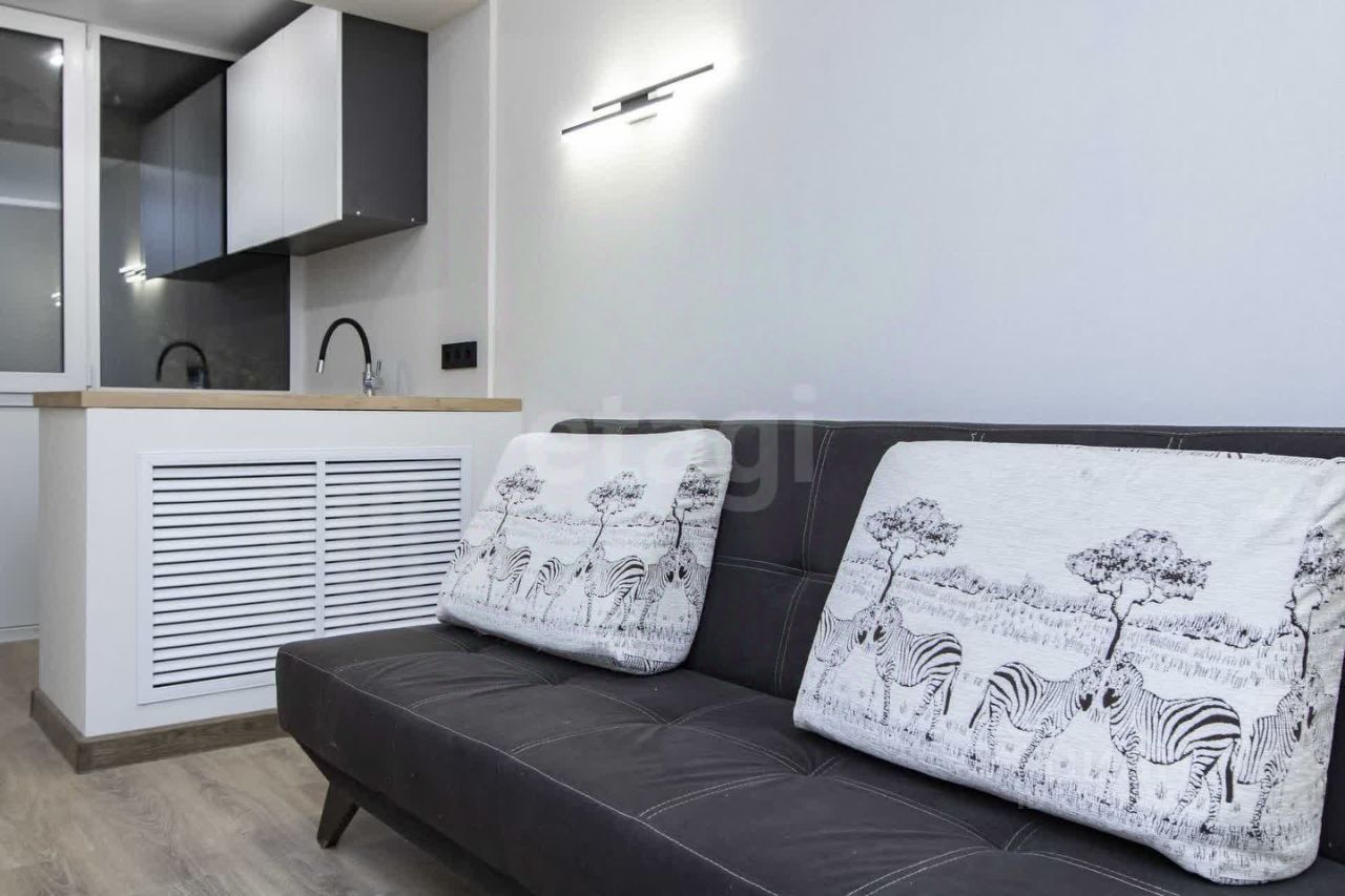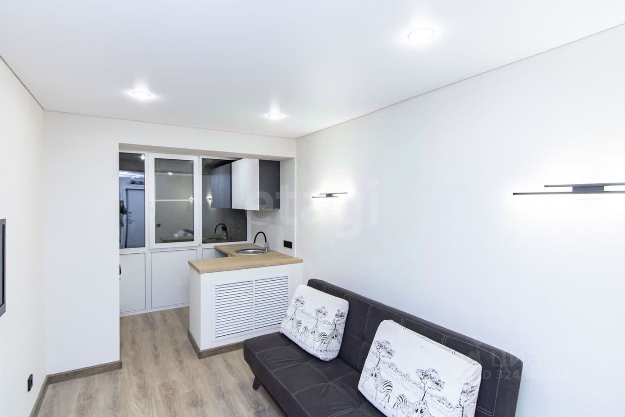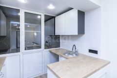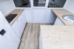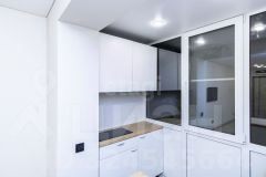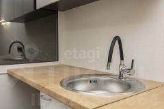 Главная особенность — функциональный балкон, где организована кухонная зона. Туда уже заведена вода и канализация для стиральной машины, установлен гарнитур с варочной панелью и раковиной.