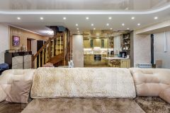 Здесь каждый найдет свое идеальное пространство: на нижнем этаже разместилась великолепная гостиная с камином, объединенная с современной кухней-столовой и просторной зоной гостиной, куда легко поместится весь большой столик для ужинов. Первая часть этажа включает также удобную зону гардеробной и функциональную ванную комнату премиум-класса.