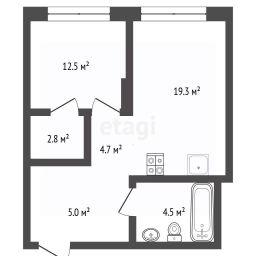 Просторная спальня (12,5 кв.м.) со своей гардеробной , кухня- гостиная 19,3 кв.м. и санузел (4,5 кв.м.).