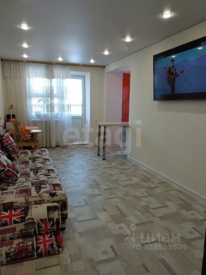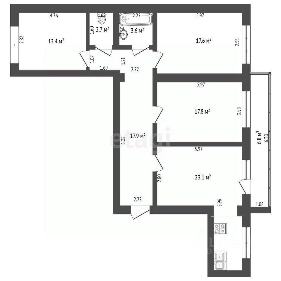 Кухня-гостиная площадью 23.1 м² служит функциональным ядром квартиры, объединяя зону для приготовления пищи и отдыха.