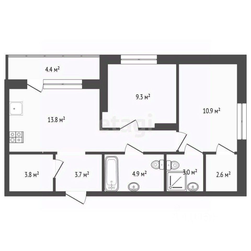 Квартира с просторной кухней - гостиной 13,8 кв.м., две изолированные спальные комнаты 10,9 кв.м. и 9,3 кв.м. ., два сан.узла 5 и 3 кв.м. ,гардеробная 3,8 кв.м.. Есть застекленный балкон 4,4 кв.м.