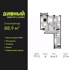 Трехкомнатная квартира с предчистовой отделкой в ЖК "Дивный квартал у озера" на 4 этаже. Общая площадь: 88.9 кв.м., жилая: 44.7 кв.м., площадь просторной кухни-столовой: 23.02 кв.м. Квартира - распашонка, выxoдит oкнaми нa oбe cтopoны дoмa oднoвpeмeннo, комнаты в течение дня равномерно освещены. В квартире два балкона, два совмещенных санузла. Высота потолков 2.7 м.