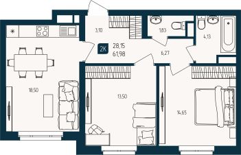 Продаётся 2-комнатная квартира в строящемся доме (Дом Семейный (ГП-3)), срок сдачи: III-кв. 2027, общей площадью 61.98 кв.м., на 2 этаже. Новый жилой комплекс "Квартал Мятный" от Специализированного застройщика "Юпитер" расположен по адресу: г. Тюмень по ул. Кулибина.