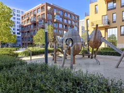Удобные пешеходные и велосипедные дорожки, оборудованные детские площадки, футбольные и баскетбольные поля, зона отдыха с фонтаном, площадка для выгула собак.