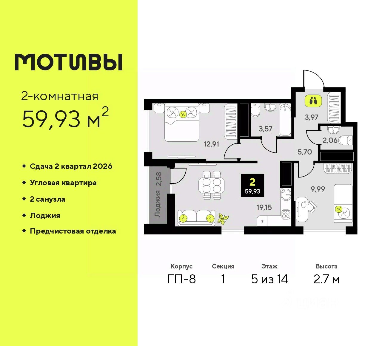 Просторная двухкомнатная квартира с предчистовой отделкой в ЖК "Мотивы" на 5 этаже. Общая площадь: 59.93 кв.м., жилая: 22.9 кв.м., площадь просторной кухни-столовой: 19.15 кв.м. Угловая квартира, идеально подойдет любителям тишины и панорамных видов. В квартире одна лоджия, один совмещенный и один раздельный санузел. Высота потолков 2.7 м.