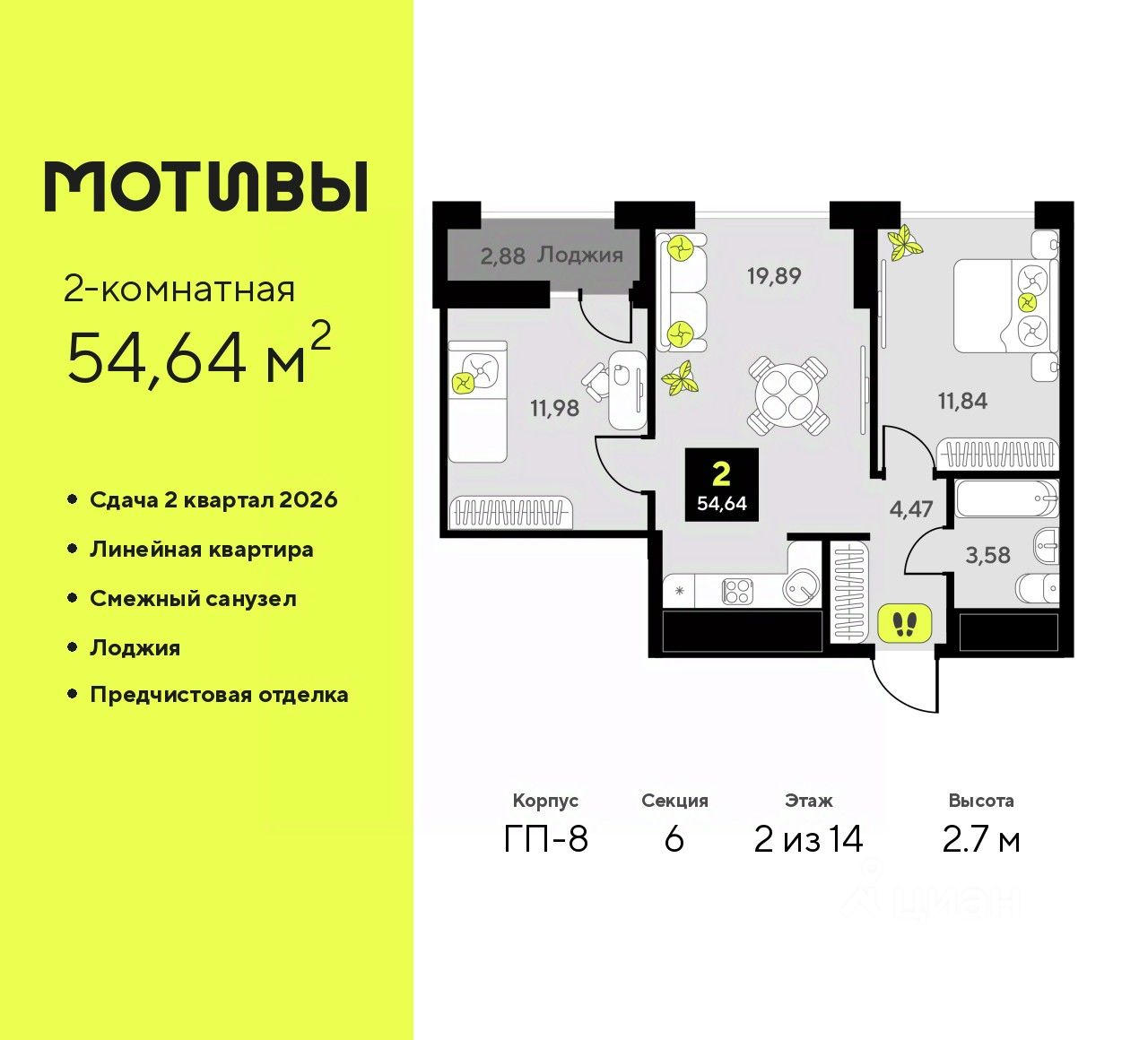 Просторная 2-комн. квартира с предчистовой отделкой в ЖК "Мотивы" на 2 этаже. Общая площадь: 54.64 кв.м., жилая: 23.82 кв.м., площадь просторной кухни-столовой: 19.89 кв.м. Комнаты изолированные, все окна выходят на одну сторону. В квартире одна лоджия, один совмещенный санузел. Высота потолков 2.7 м.