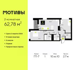 Продается 2-комн. квартира от застройщика с предчистовой отделкой в ЖК "Мотивы" на 10 этаже. Общая площадь: 62.78 кв.м., жилая: 23.91 кв.м., площадь просторной кухни-столовой: 18.93 кв.м. Квартира угловая, идеально подойдет любителям тишины и панорамных видов. В квартире одна лоджия, два совмещенных санузла. Высота потолков 2.7 м.