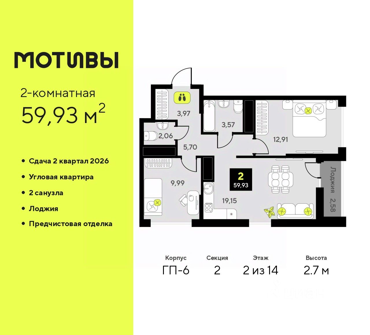 Двухкомнатная квартира с предчистовой отделкой в ЖК "Мотивы" на 2 этаже. Общая площадь: 59.93 кв.м., жилая: 22.9 кв.м., площадь просторной кухни-столовой: 19.15 кв.м. Квартира угловая, идеально подойдет любителям тишины и панорамных видов. В квартире одна лоджия, один совмещенный и один раздельный санузел. Высота потолков 2.7 м.