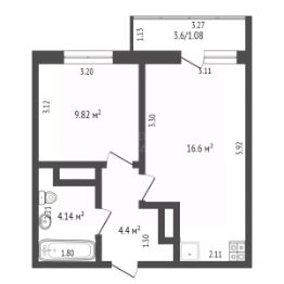 Формат 1 (46,4 м²) просторная кухня-гостиная 20 м² с выходом на балкон