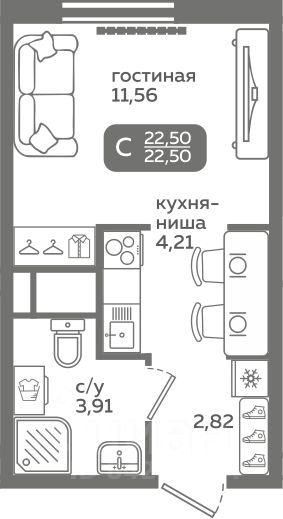 Прямая продажа от застройщика! Продается студия в строящемся ЖК "Меридиан Слобода", срок сдачи: I-кв. 2027, общей площадью 22.5 м², на 8 этаже из 21. Площадь кухни — 4.21 м².