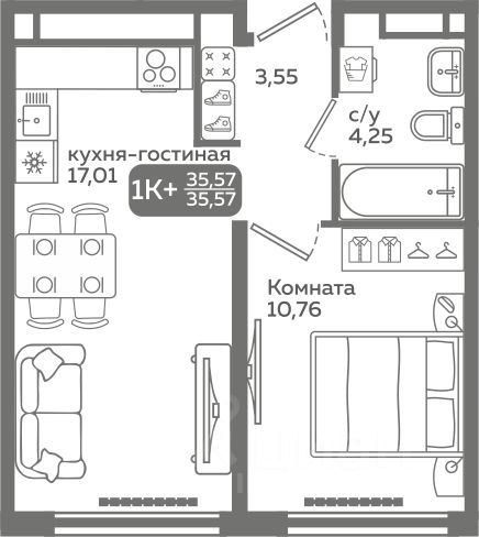 Прямая продажа от застройщика! Продается однокомнатная квартира в строящемся ЖК "Меридиан Слобода", срок сдачи: I-кв. 2027, общей площадью 35.57 м², на 10 этаже из 21. Площадь кухни — 17.01 м².