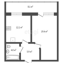 Классическая планировка с большими помещениями. Просторная гостиная 19,4 м² с нишей, где легко обустроить уютную спальню или рабочее место. Функциональный квадратный коридор. Отдельная кухня 12,1 м² — хватит места для обеденной зоны. Большая застекленная лоджия 8,1 м² — ваше дополнительное пространство для отдыха (не входит в общую площадь).