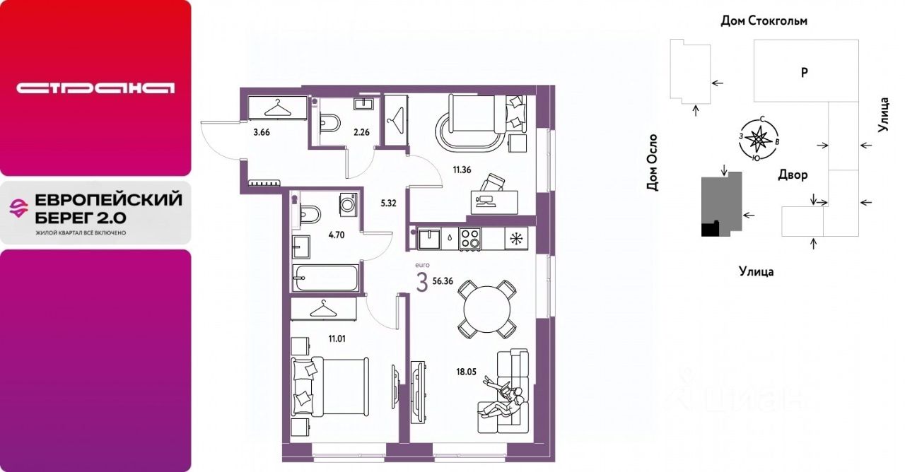 Продается 3комнатная квартира на 2 этаже от застройщика Страна Девелопмент. Площадь квартиры 56,36 кв. м.