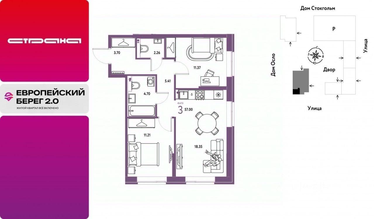Продается 3комнатная квартира на 10 этаже от застройщика Страна Девелопмент. Площадь квартиры 57 кв. м.