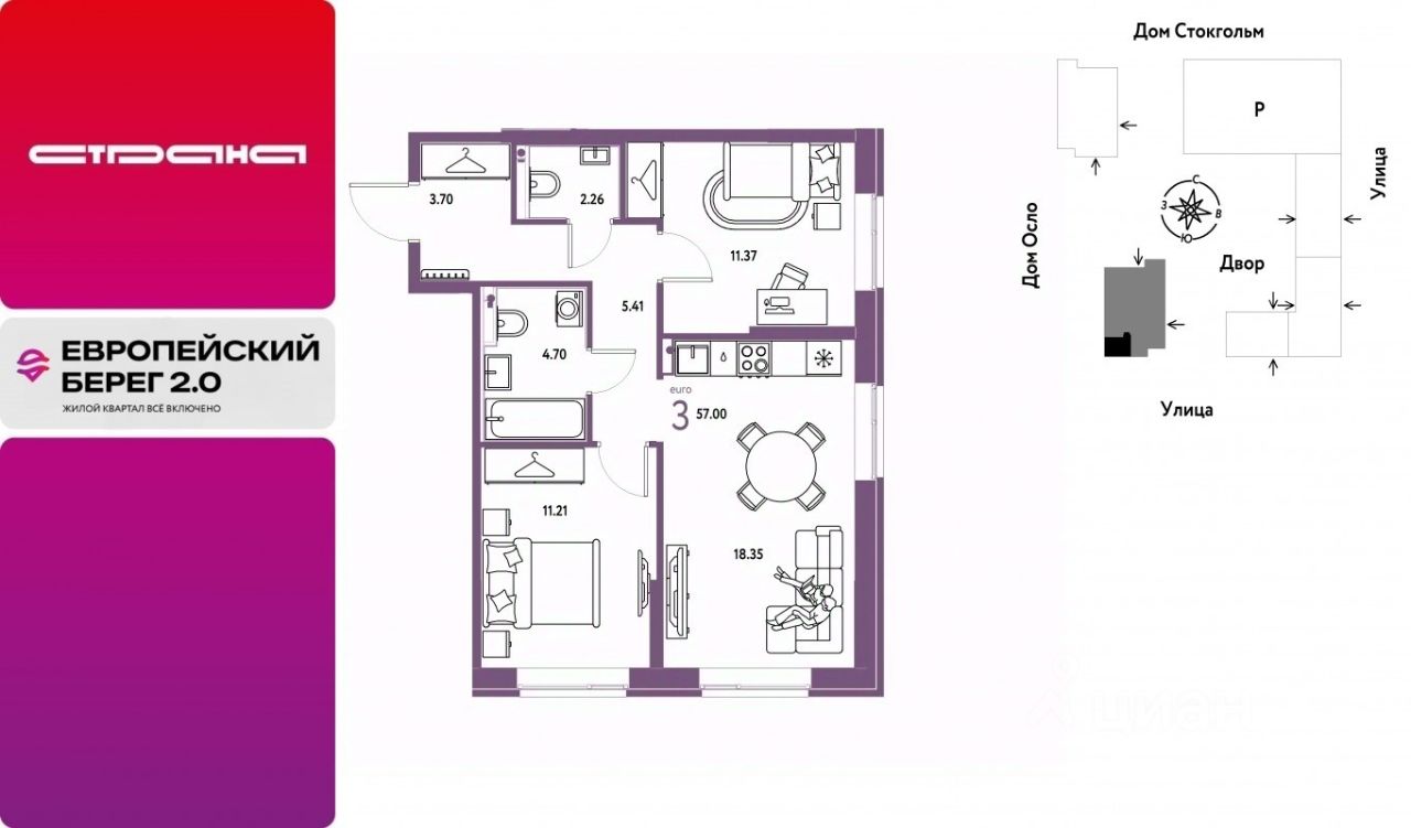 Продается 3комнатная квартира на 14 этаже от застройщика Страна Девелопмент. Площадь квартиры 57 кв. м.