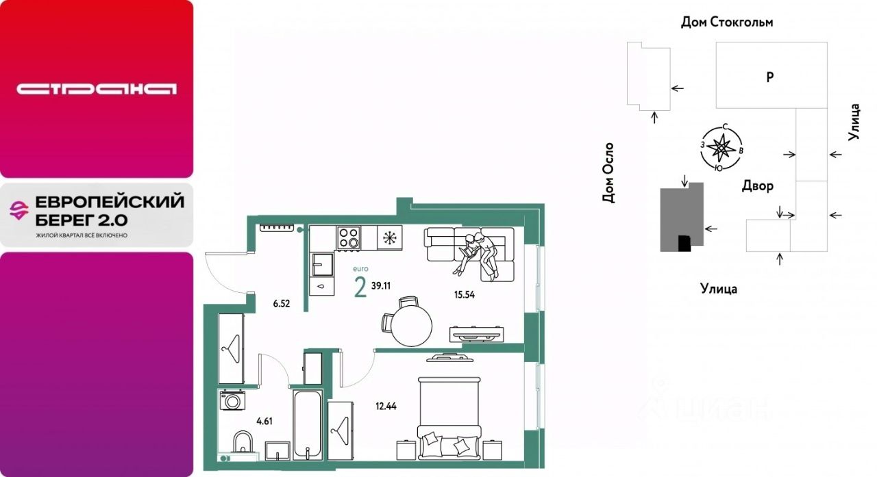 Продается 2комнатная квартира на 15 этаже от застройщика Страна Девелопмент. Площадь квартиры 39,11 кв. м.