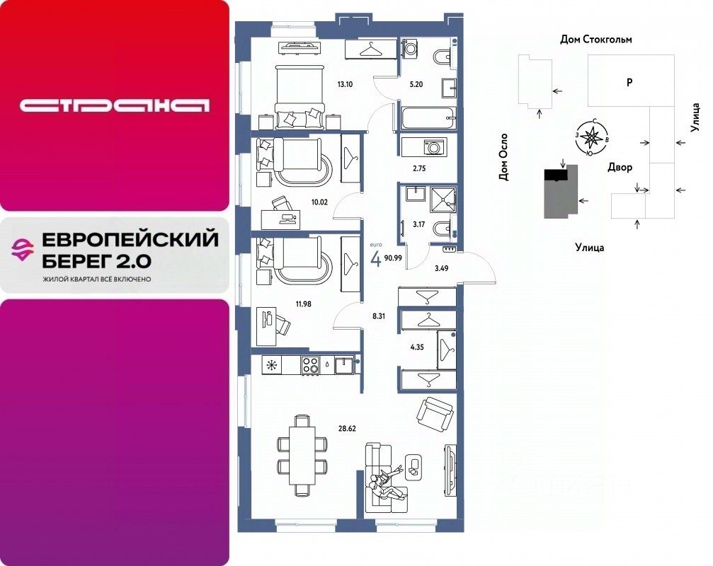 Продается 4комнатная квартира на 23 этаже от застройщика Страна Девелопмент. Площадь квартиры 90,99 кв. м.