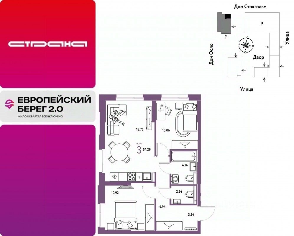 Продается 3комнатная квартира на 4 этаже от застройщика Страна Девелопмент. Площадь квартиры 54,31 кв. м.