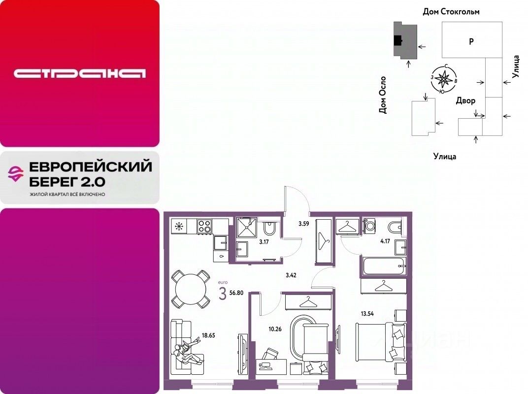 Продается 3комнатная квартира на 5 этаже от застройщика Страна Девелопмент. Площадь квартиры 56,8 кв. м.