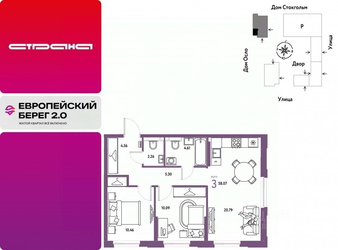 Продается 3комнатная квартира на 8 этаже от застройщика Страна Девелопмент. Площадь квартиры 58,07 кв. м.