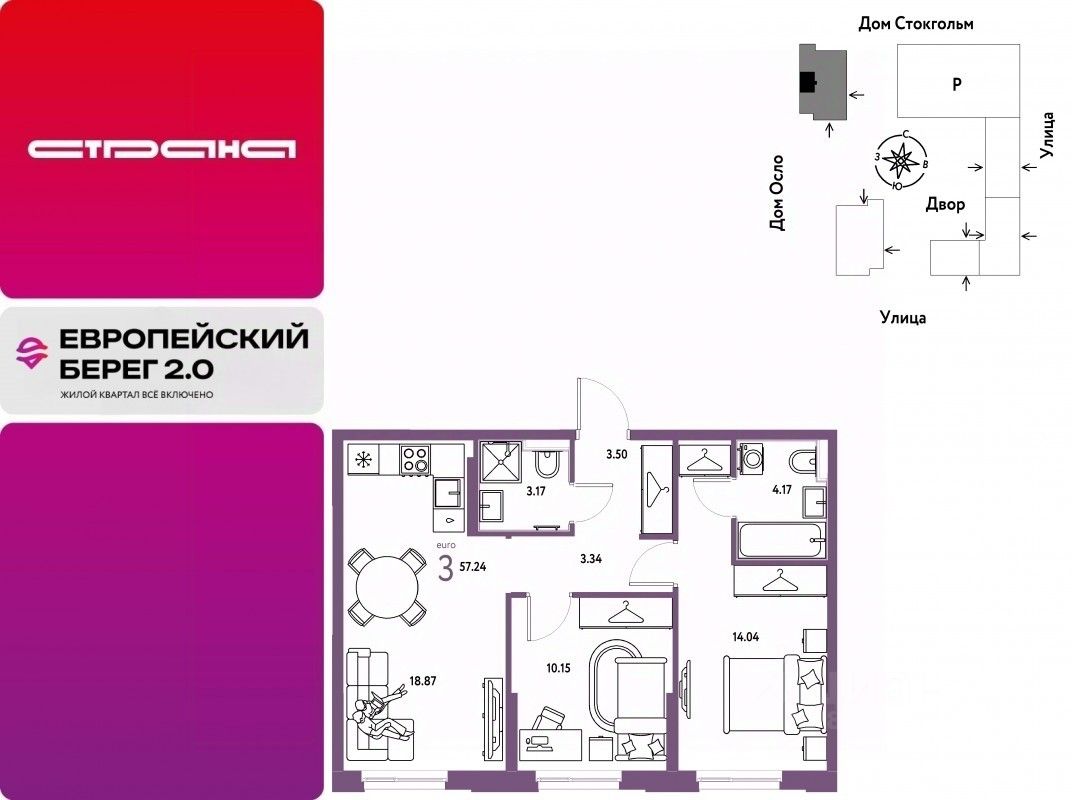 Продается 3комнатная квартира на 10 этаже от застройщика Страна Девелопмент. Площадь квартиры 57,24 кв. м.