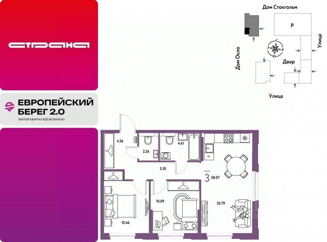 Продается 3комнатная квартира на 19 этаже от застройщика Страна Девелопмент. Площадь квартиры 58,07 кв. м.