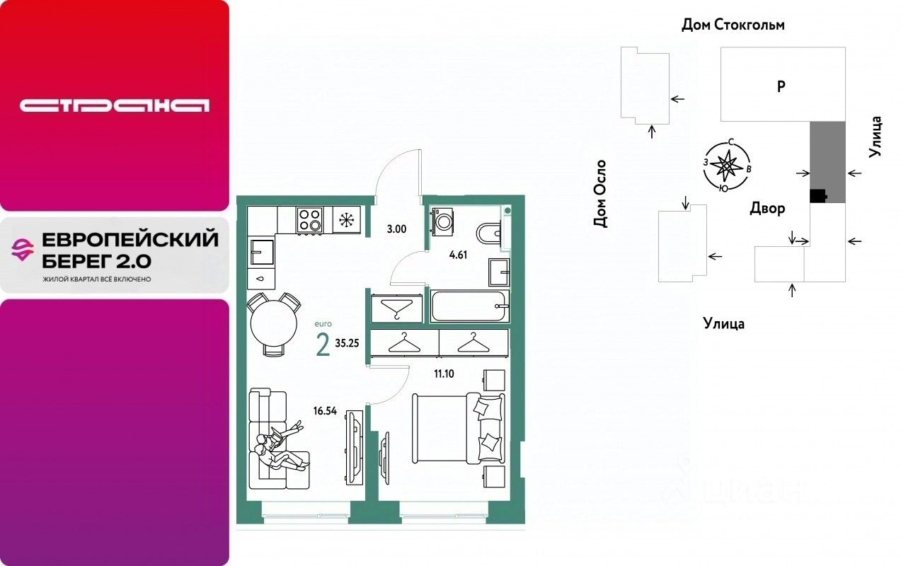 Продается 2комнатная квартира на 2 этаже от застройщика Страна Девелопмент. Площадь квартиры 35,25 кв. м.