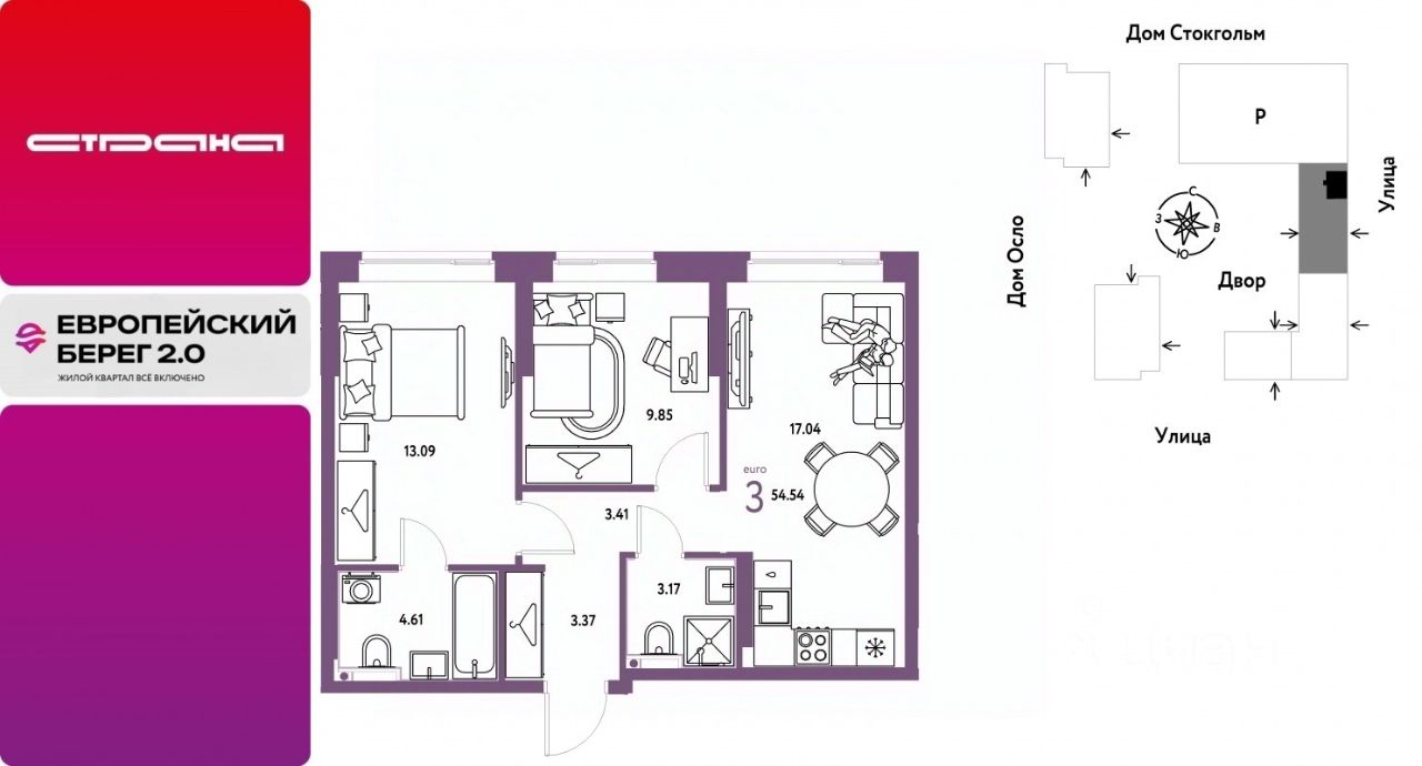 Продается 3комнатная квартира на 5 этаже от застройщика Страна Девелопмент. Площадь квартиры 54,54 кв. м.