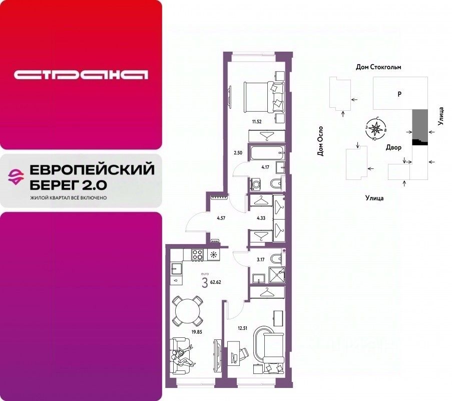 Продается 3комнатная квартира на 5 этаже от застройщика Страна Девелопмент. Площадь квартиры 62,62 кв. м.