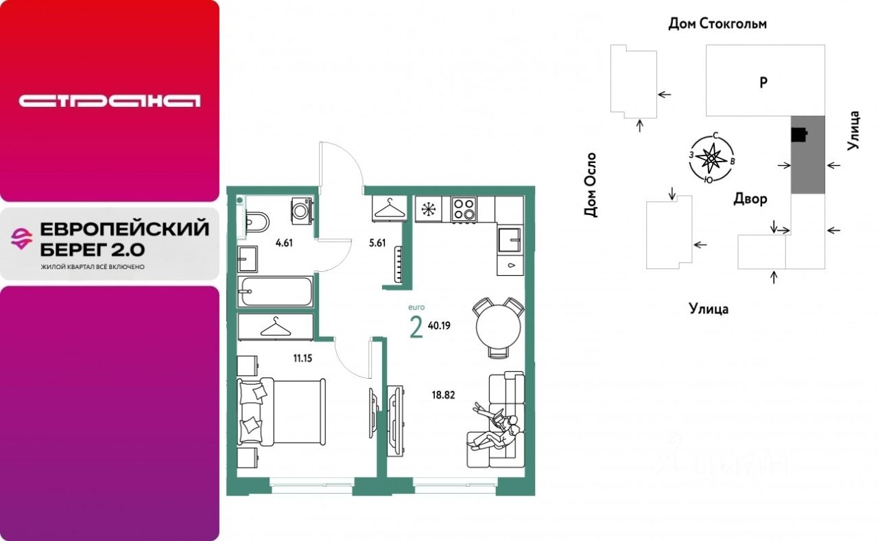 Продается 2комнатная квартира на 8 этаже от застройщика Страна Девелопмент. Площадь квартиры 40,19 кв. м.