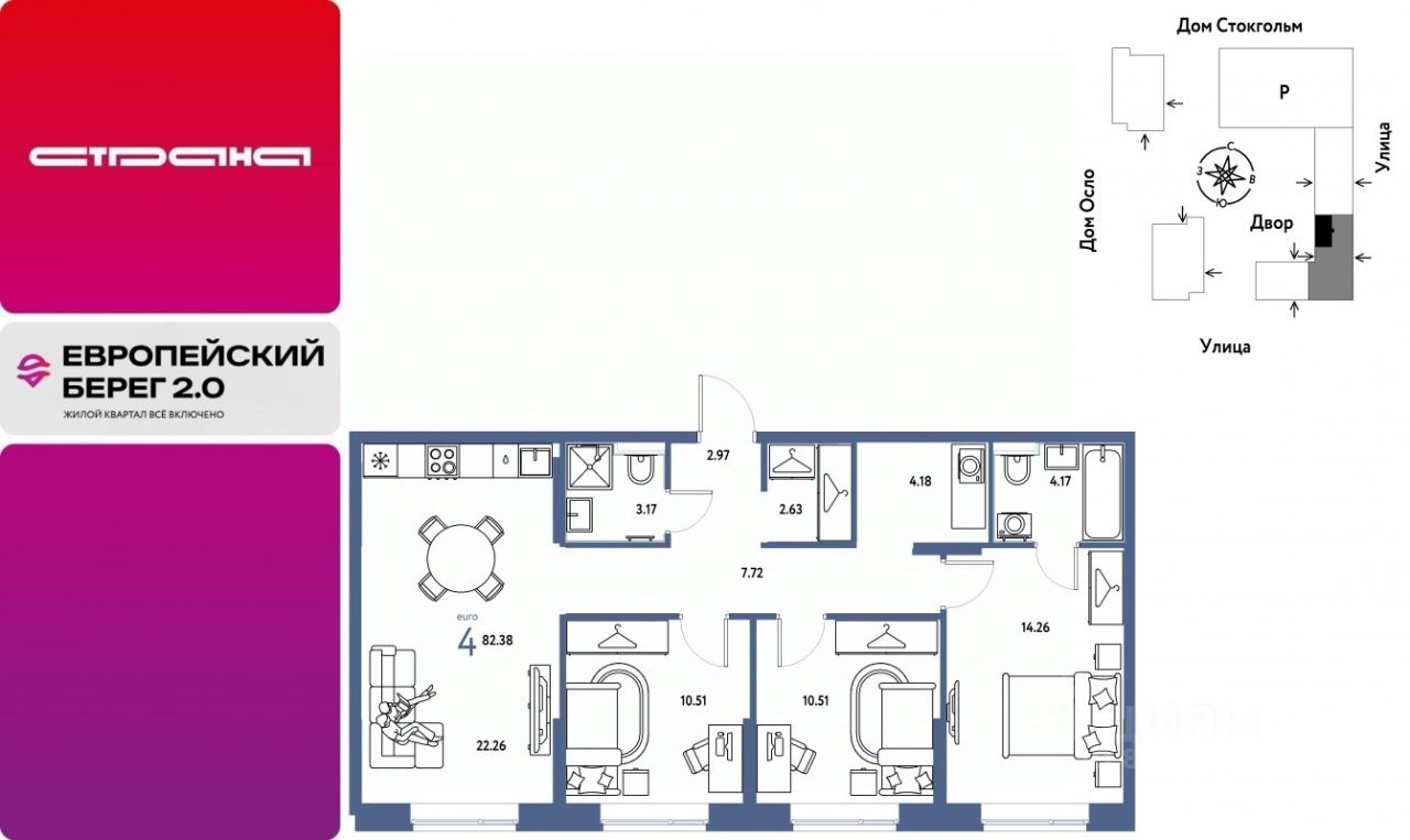 Продается 4комнатная квартира на 4 этаже от застройщика Страна Девелопмент. Площадь квартиры 82,38 кв. м.