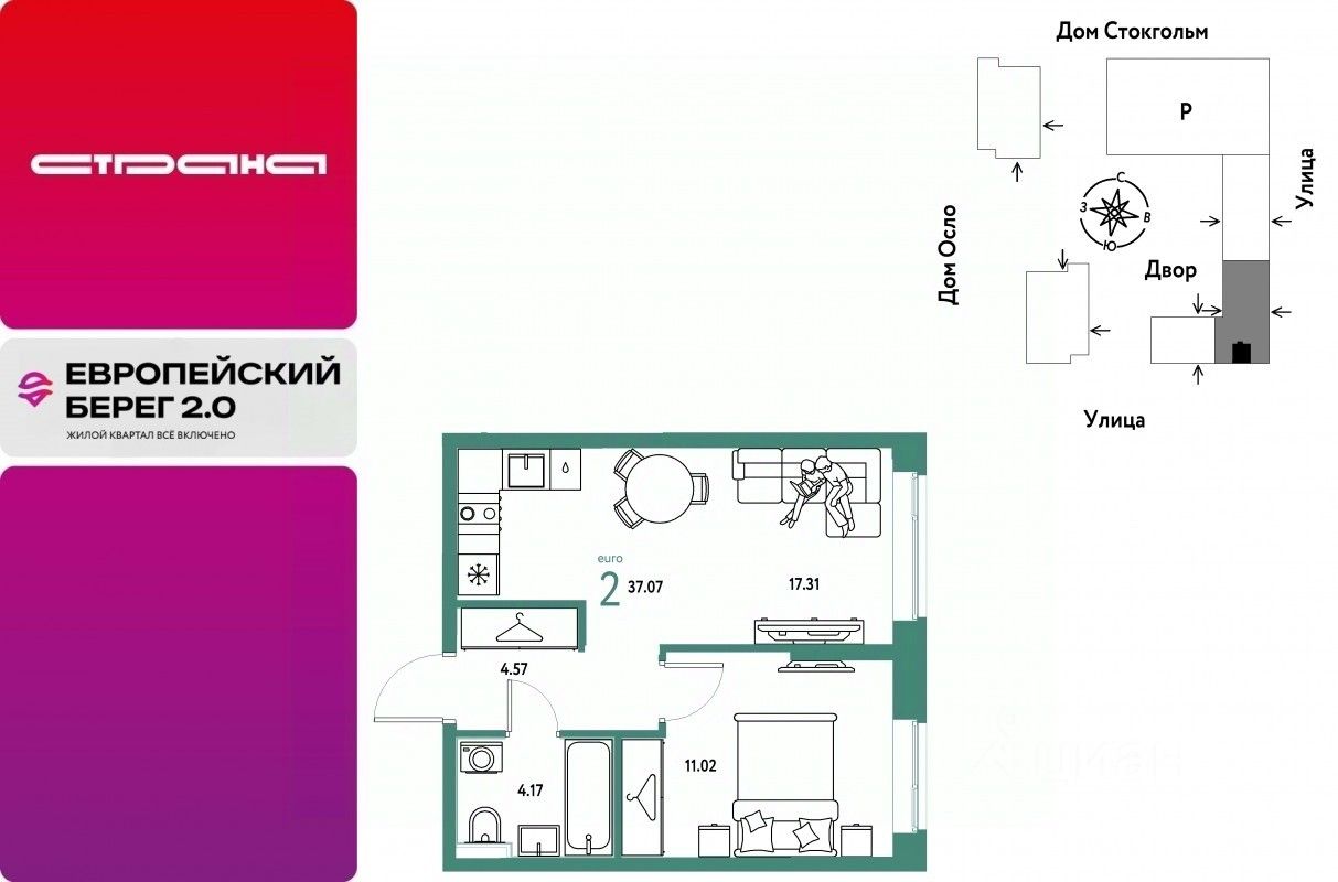 Продается 2комнатная квартира на 5 этаже от застройщика Страна Девелопмент. Площадь квартиры 37,07 кв. м.