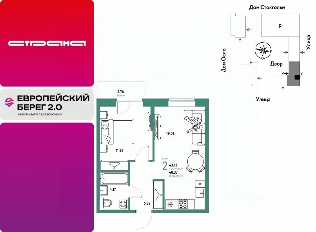 Продается 2комнатная квартира на 6 этаже от застройщика Страна Девелопмент. Площадь квартиры 43,13 кв. м.