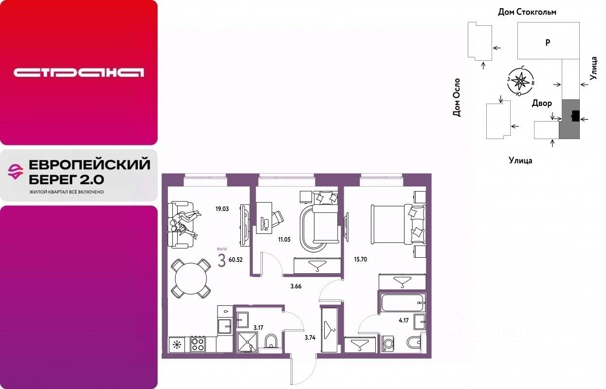 Продается 3комнатная квартира на 8 этаже от застройщика Страна Девелопмент. Площадь квартиры 60,52 кв. м.