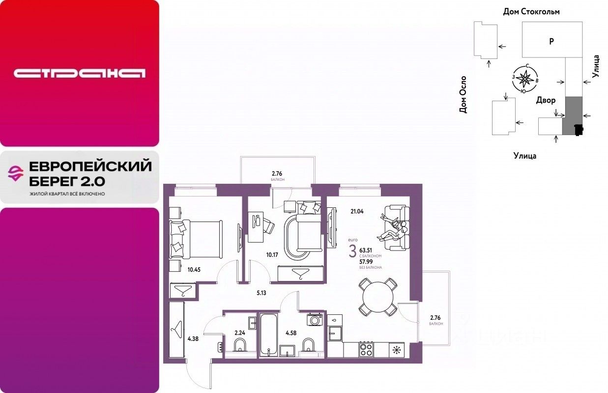 Продается 3комнатная квартира на 8 этаже от застройщика Страна Девелопмент. Площадь квартиры 63,51 кв. м.